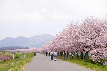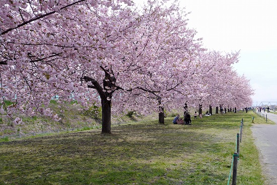 この桜並木は八重桜で、写真を撮った時は薄曇りだったが