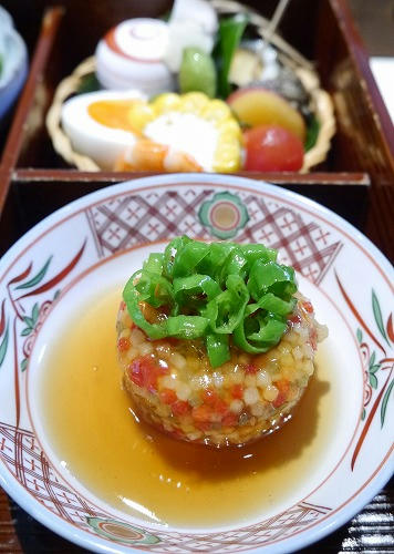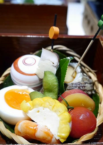 とうもろこしの射込み、エビ、瓢亭玉子、枝豆。
