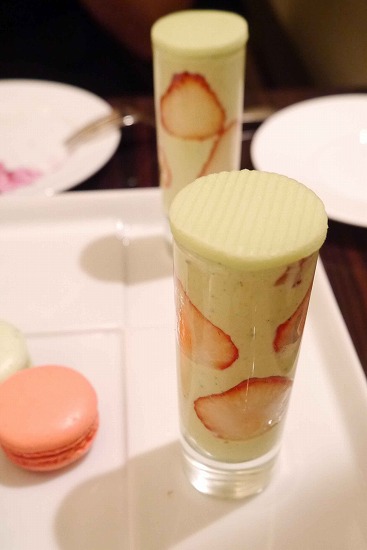 素敵なグラスにはピスタチオと苺のムース。