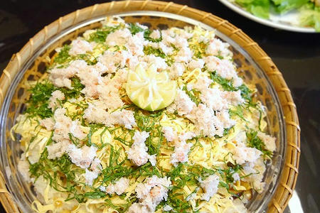 カニを散らし、酢橘を花型に切ったものを添える。