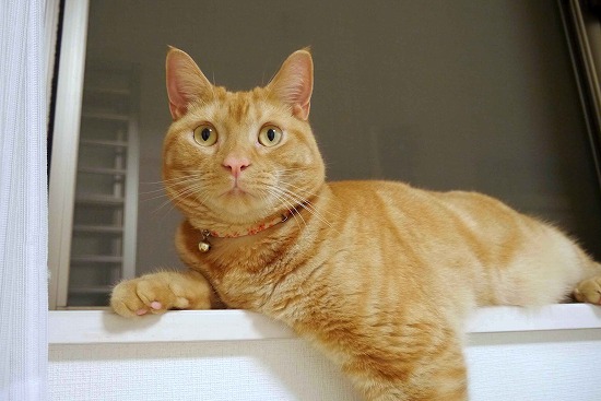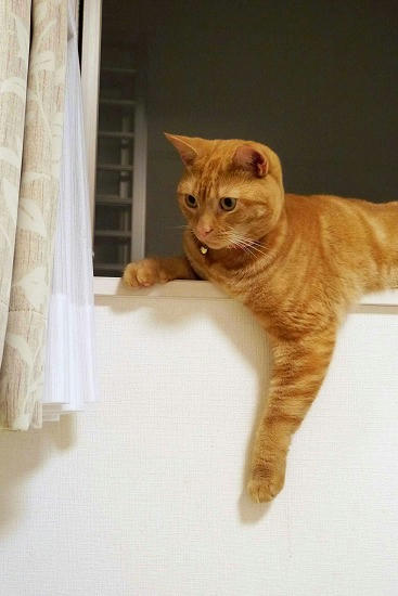 いつもは姉猫がいるので上がれない1階の窓の桟で寛ぐ若猫。