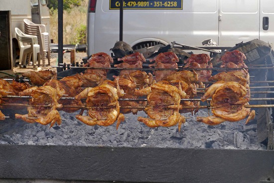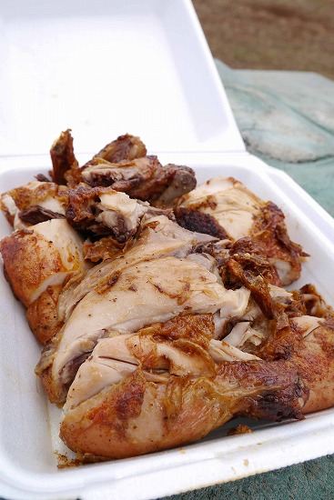 もうもうと立ち込める煙の中、鶏が焼きあがっていく。
