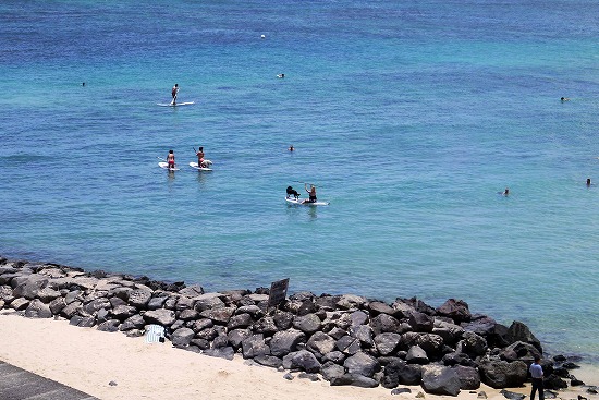 波打ち際を遊ぶ犬や、アウトリガーの練習をする人を視界に入れ
