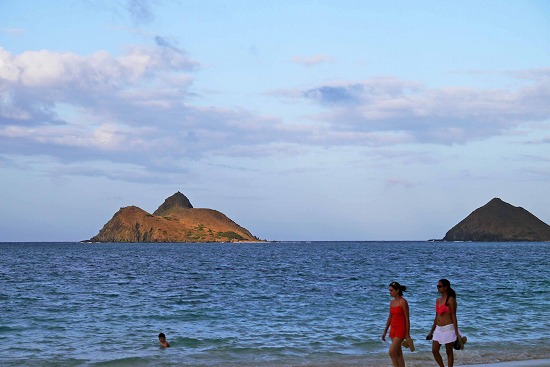 カレンダーにもよく使われる、夕暮れのラニカイ・ビーチから見た2つの島。