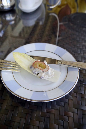 エンダイブにチキンのサラダ、ブドウの薄切りをのせたもの。
