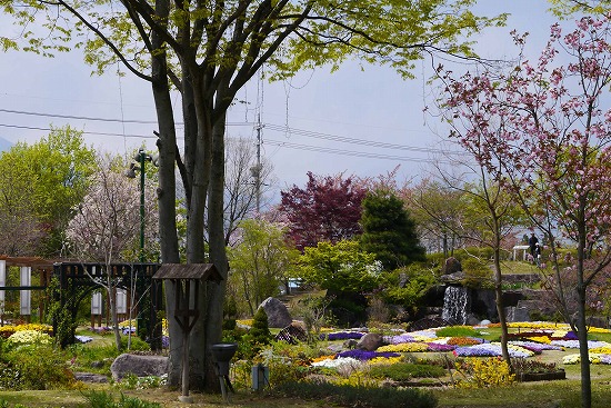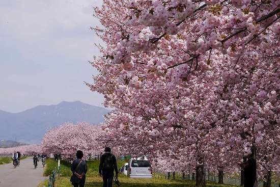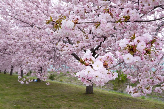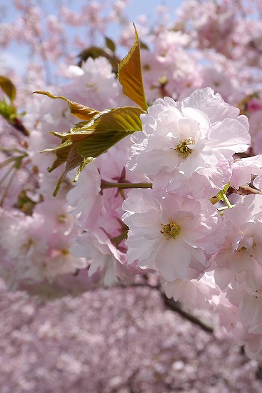 この桜並木は八重桜で、写真を撮った時は薄曇りだったが