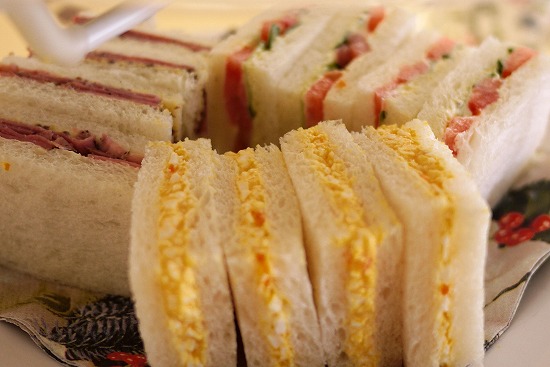タマゴ、パストラミビーフ、きゅうりとトマトのサンドイッチ。