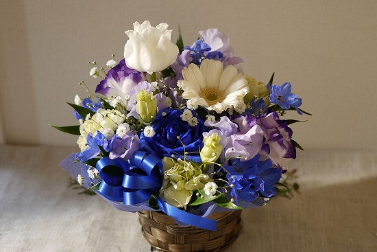 いただいたアレンジメントをよく見たら、中心に青いバラ。