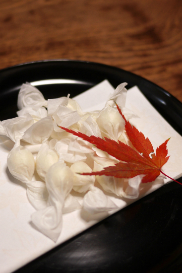 黒の塗りのお盆に懐紙を敷き、庭の赤い紅葉が添えられている。