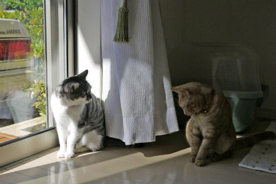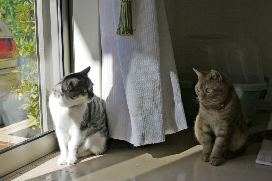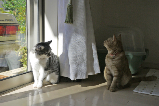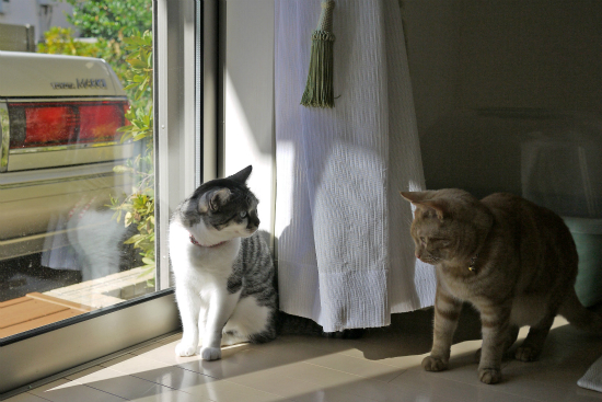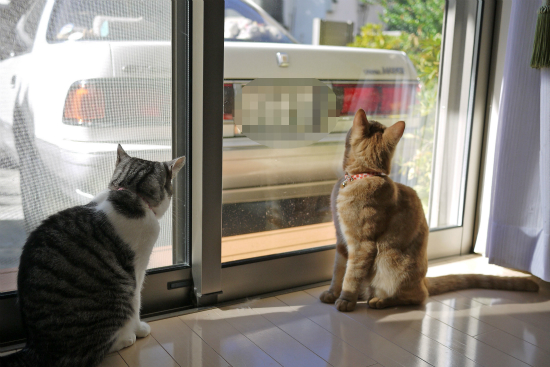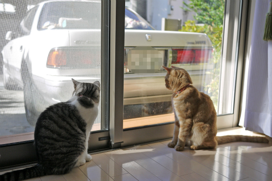 仲良く並んで外を見ているように見える猫