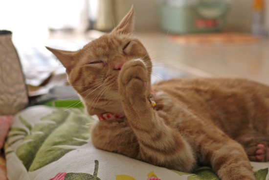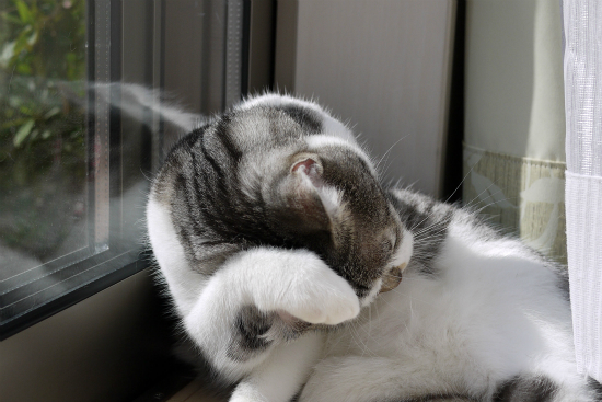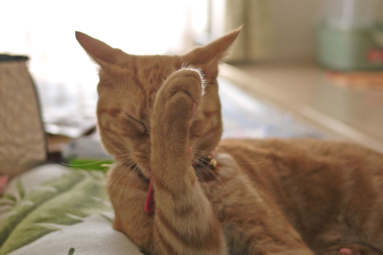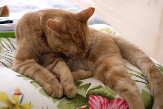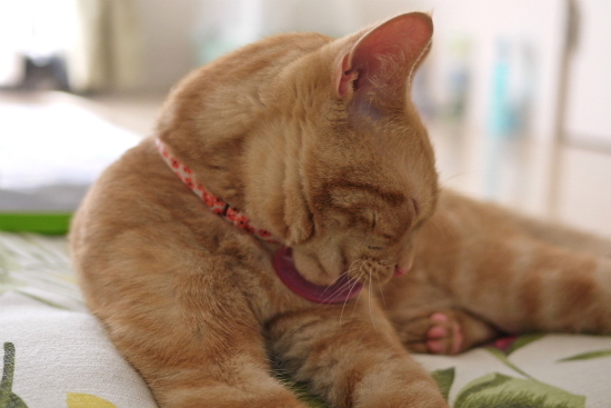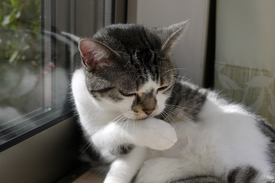 毛づくろいで疲れてしまい、そのまま寝てしまう猫。
