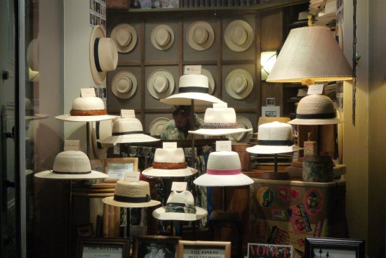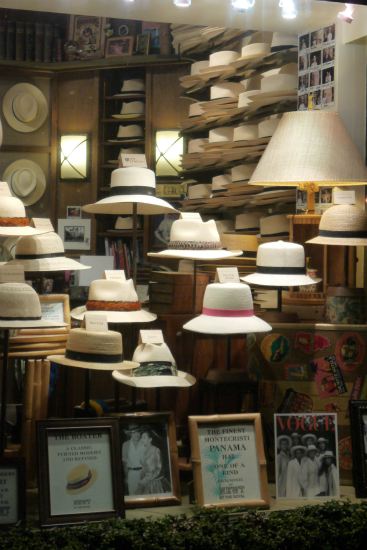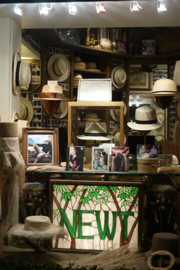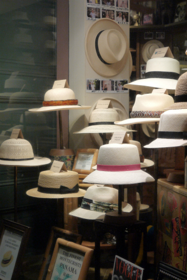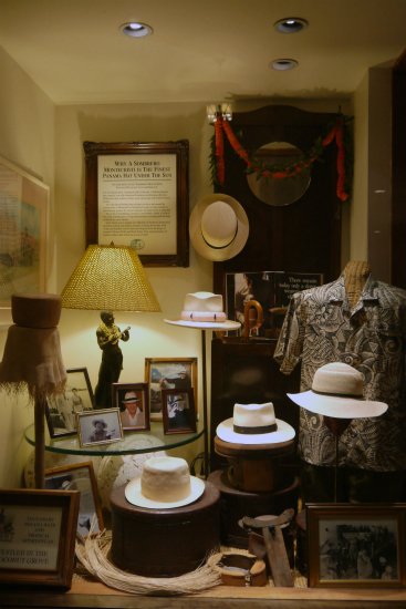 カウンターの中にいる男性の後ろにディスプレイしてあるパナマ帽。