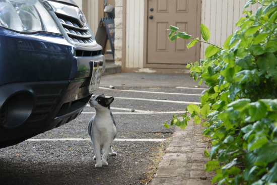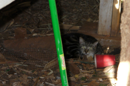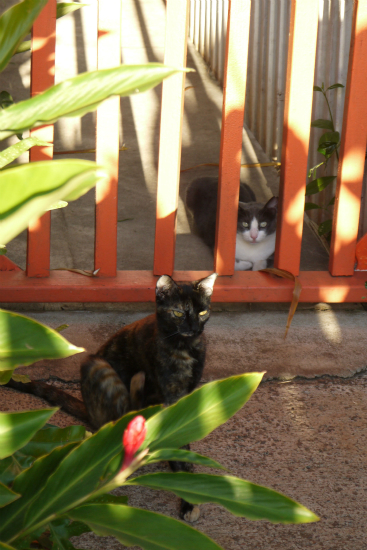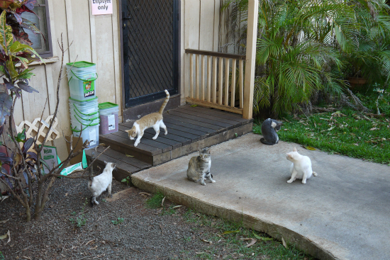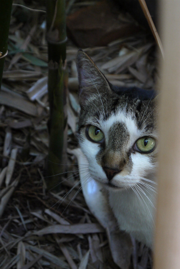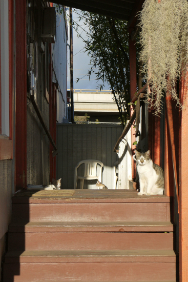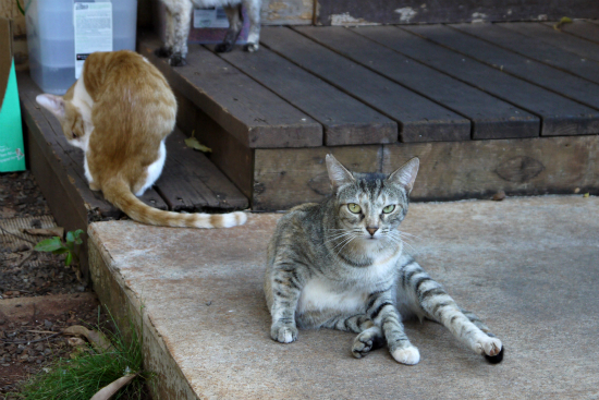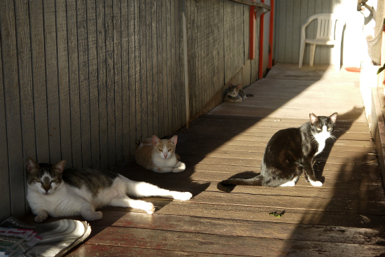 私たちを見ると、若い猫2匹を守るように位置を移動した。