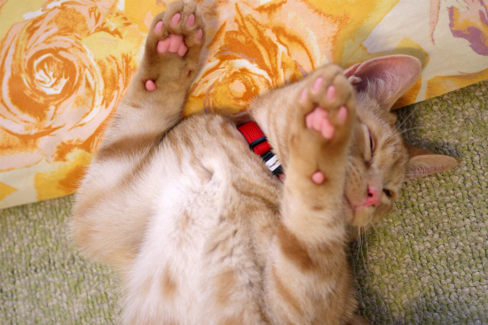 自慢のコーラルピンクの肉球まで見せて