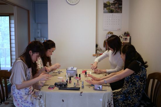 ネイリスト椿が全員の爪にアートを施す。