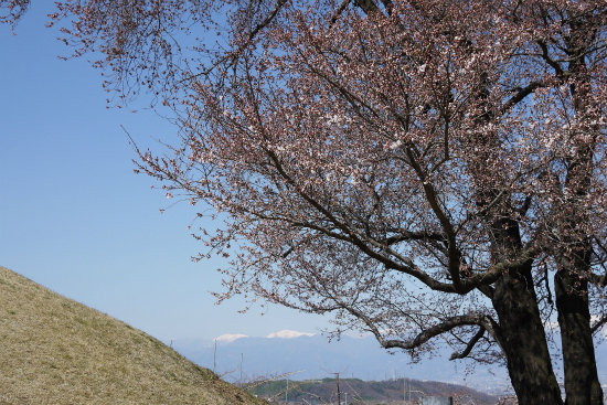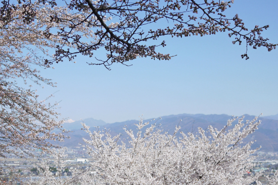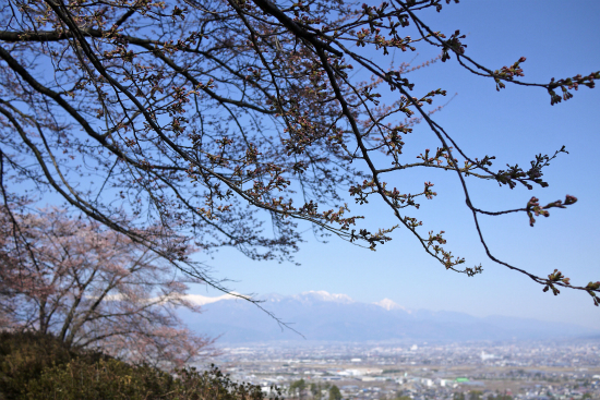 甲府盆地と八ヶ岳を背景に、満開になった桜は