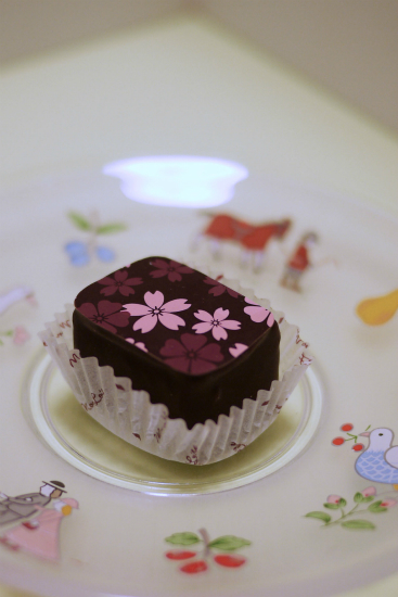 桜のデザインをほどこしたダークチョコレートでコーティング。