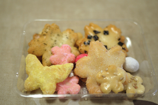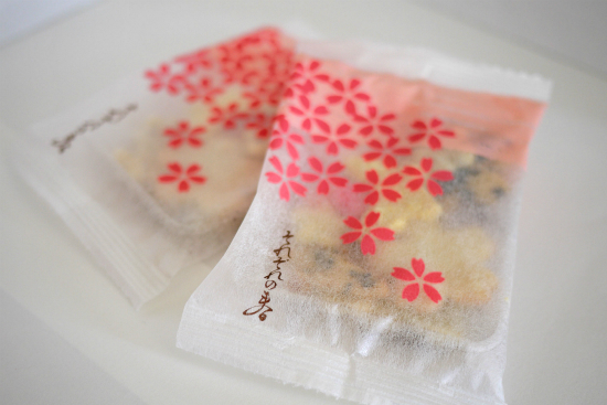 大小の彩りも美しい味とりどりの桜型の煎餅に