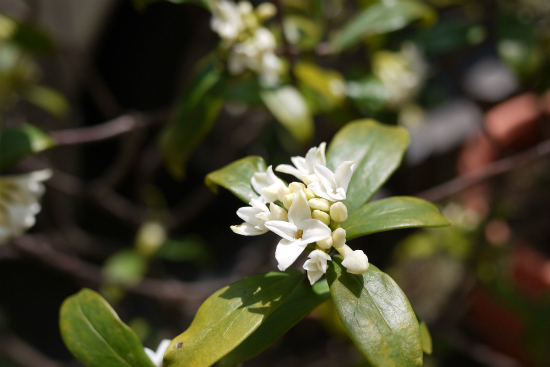 2本ある白い沈丁花が、1本は満開。1本は5分咲きだ。