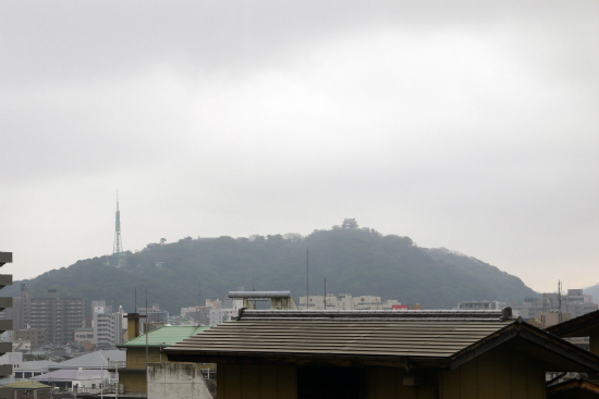 山の上に小さく松山城が見える。