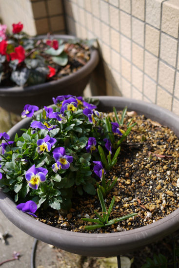旅立ちの支度は庭の菫二色 椿