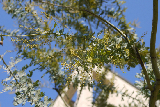 すっきりした枝のミモザの花芽も、なんとなく膨らんで