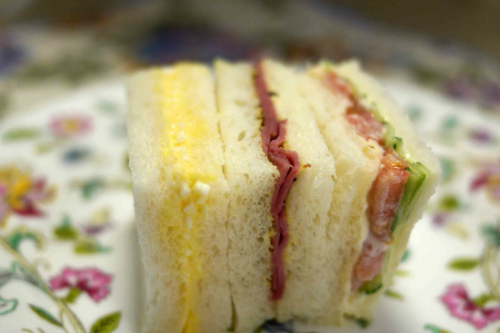代わり映えしないが、玉子、パストラミ・ビーフ、トマトとキュウリのサンドイッチ。