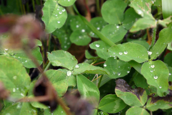 アカツメクサの葉っぱが水滴でキラキラしている。