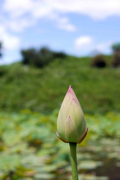 蓮の蕾の背景にはイマイチ似合わない青空。