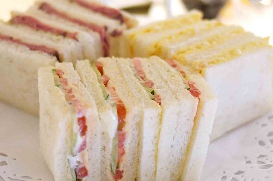 玉子、ローストビーフ、トマトとキュウリのサンドイッチ。