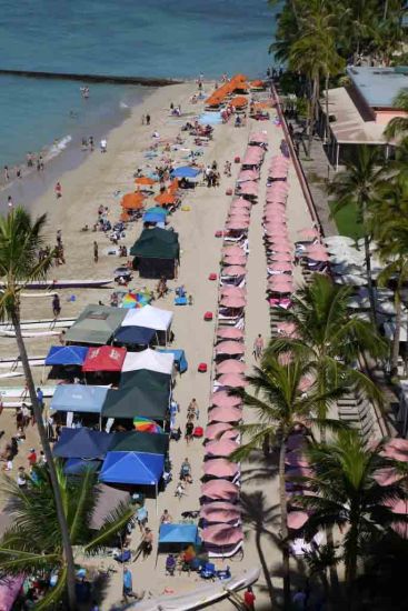 ビーチを見下ろすと、お隣のピンクパレスのパラソルが