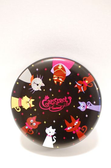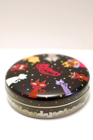 缶の表には夜空に猫が、側面には夜の街並みのイラスト。