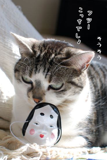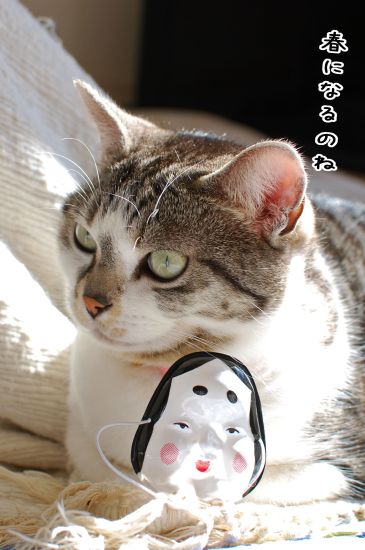 んー、でもさ、白っぽい猫に白いお面は