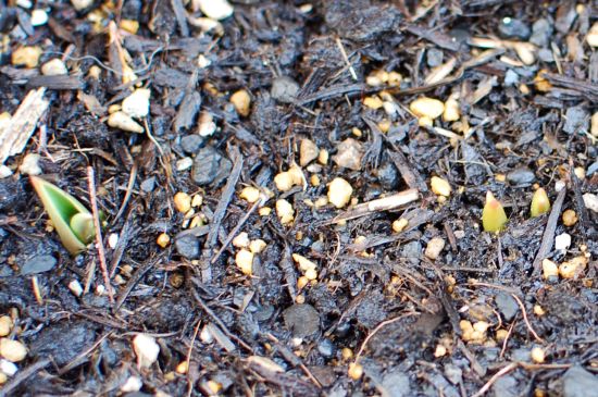 そういえば、チューリップの芽がほんの5ミリほどだが、出てきた。