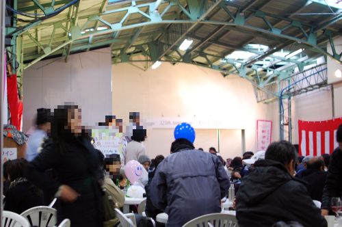 台風の影響で雨風が強いので、工場内に模擬店やテーブルが並ぶ。