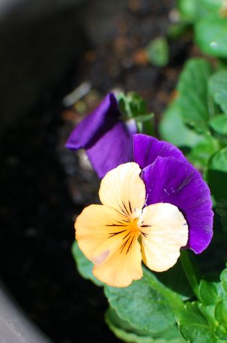 濃い紫にはっきりとした黄色の花びらのヴィオラと