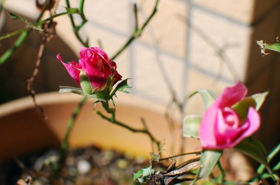 すっかり葉っぱが落ちたが、まだ蕾をつけている絞りのミニバラ。