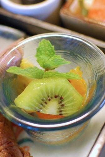 涼しげなガラスの器にキゥイ、メロン、スイカが
