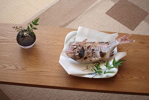 三原名産、タコの酢の物、茗荷のせ。鯛の焼き物に