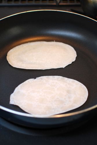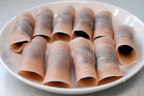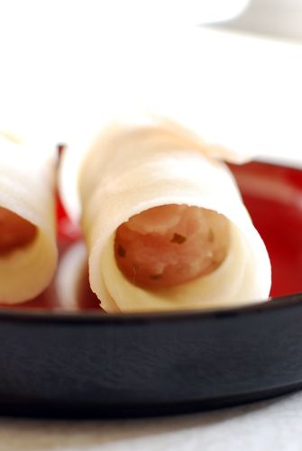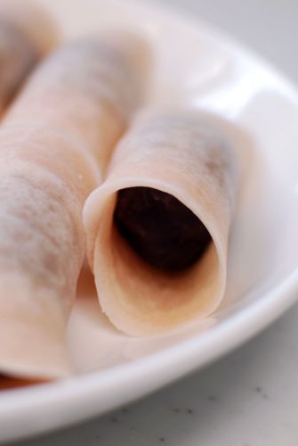 丸めたあんを皮にのせ、はしからくるくる巻く。