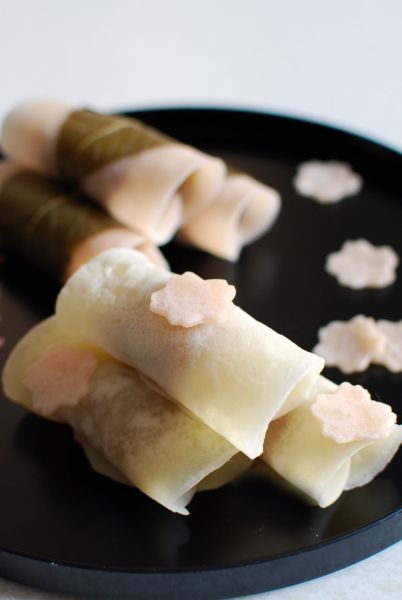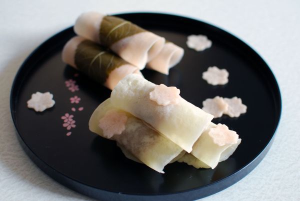 この後に、塩抜きして水気をペーパータオルで拭いた桜の葉を巻く。
