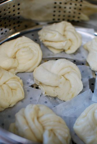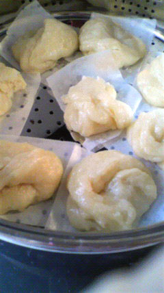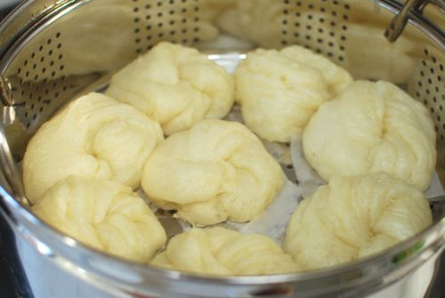成形して、お湯を張った蒸し器で最終発酵させる。