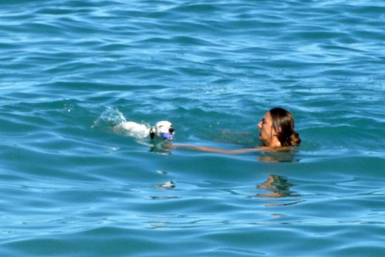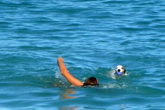 走り終わって海を見ていると、犬と一緒に遊ぶ女性が。