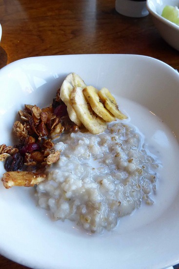 オートミールにドライフルーツとナッツ、ミルクをかける。