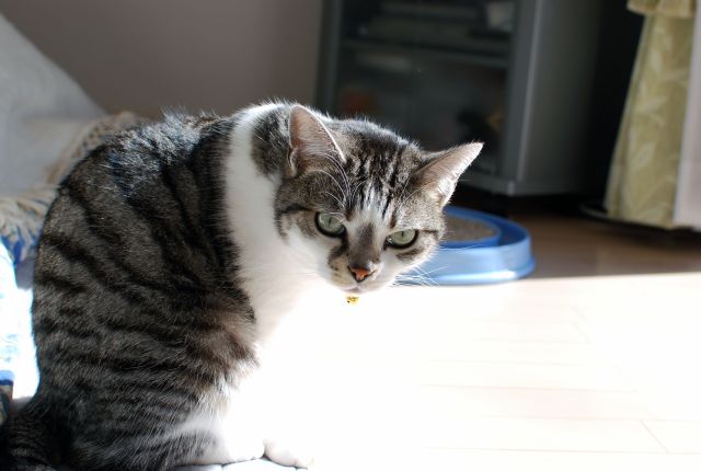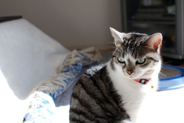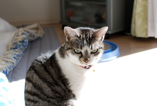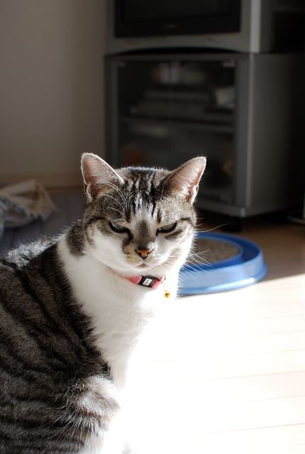 単焦点レンズで撮った窓際の猫はずいぶん明るい。