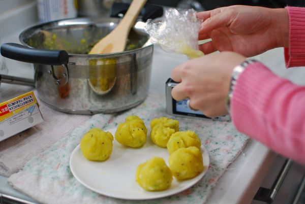 そしてサツマ芋を茹で、潰し、パイン缶、キウィ、りんごを混ぜ
