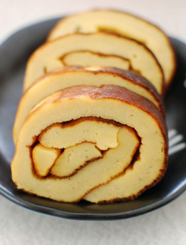 フライパンでホットケーキの要領で焼き、巻き簾で巻いて冷ます。