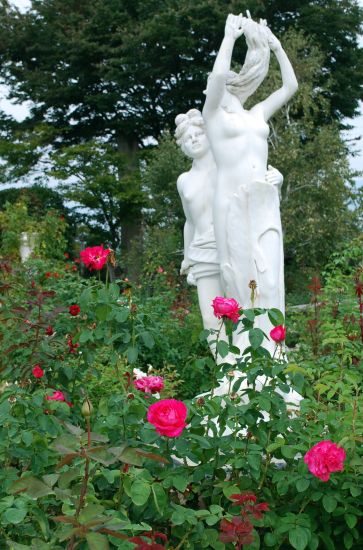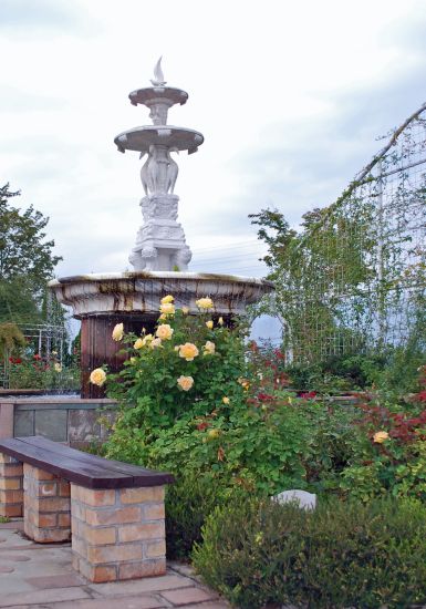 バラの先にはギリシャ風の噴水が。