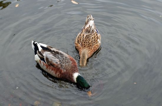 池にはつがいの鴨が、水の中の食べ物を探して忙しそうだ。