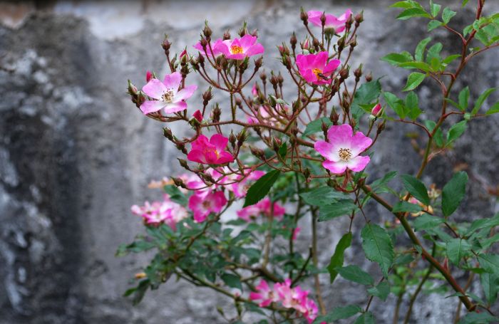 壁の下の方には一重のバラ。